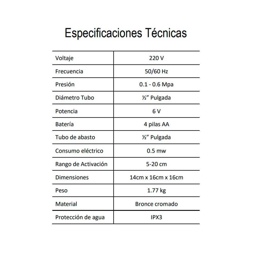 El Grifo Saria con sensor automático tiene un rango de sensor ajustable que hace que tu vida sea más cómoda y saludable. Se puede detectar dentro de un rango fijo y detener cuando retiras las manos. Hecho de bronce con acabado cromado de alta calidad y rendimiento de larga duración. El grifo eficiente reduce el uso general del agua sin sacrificar la presión de la misma. Sensor con sistema dual, alimentado por 4 pilas AA (aproximadamente 7000 veces o 3 años para uso diario en el hogar) o corriente eléctrica. Instrucciones de instalación detalladas con diagrama incluido. Viene con todos los accesorios necesarios para la instalación. No es necesario comprar piezas adicionales.